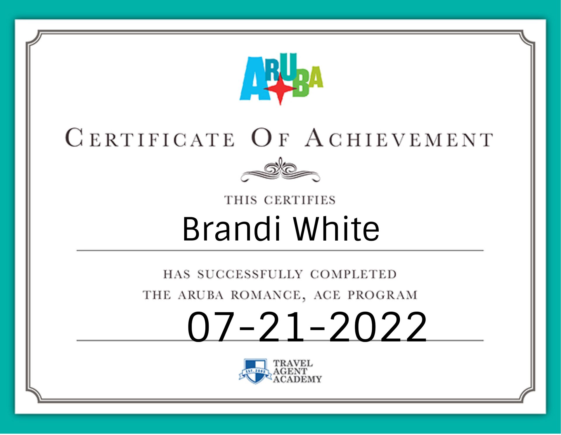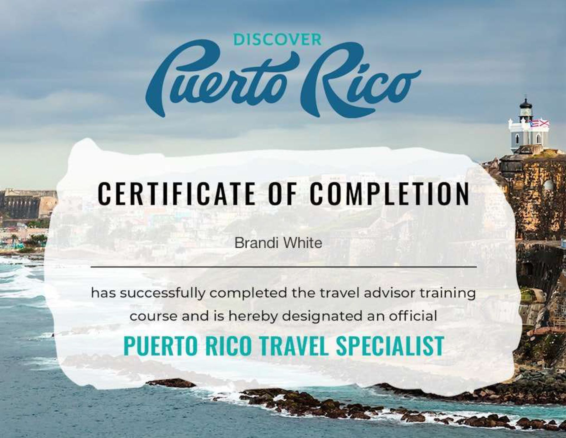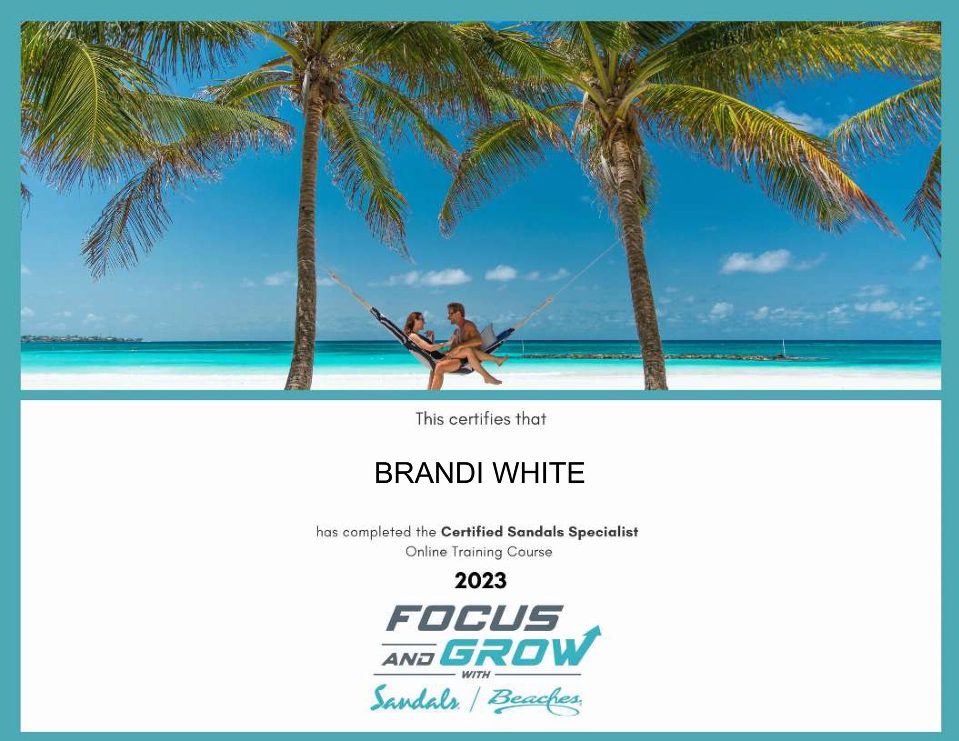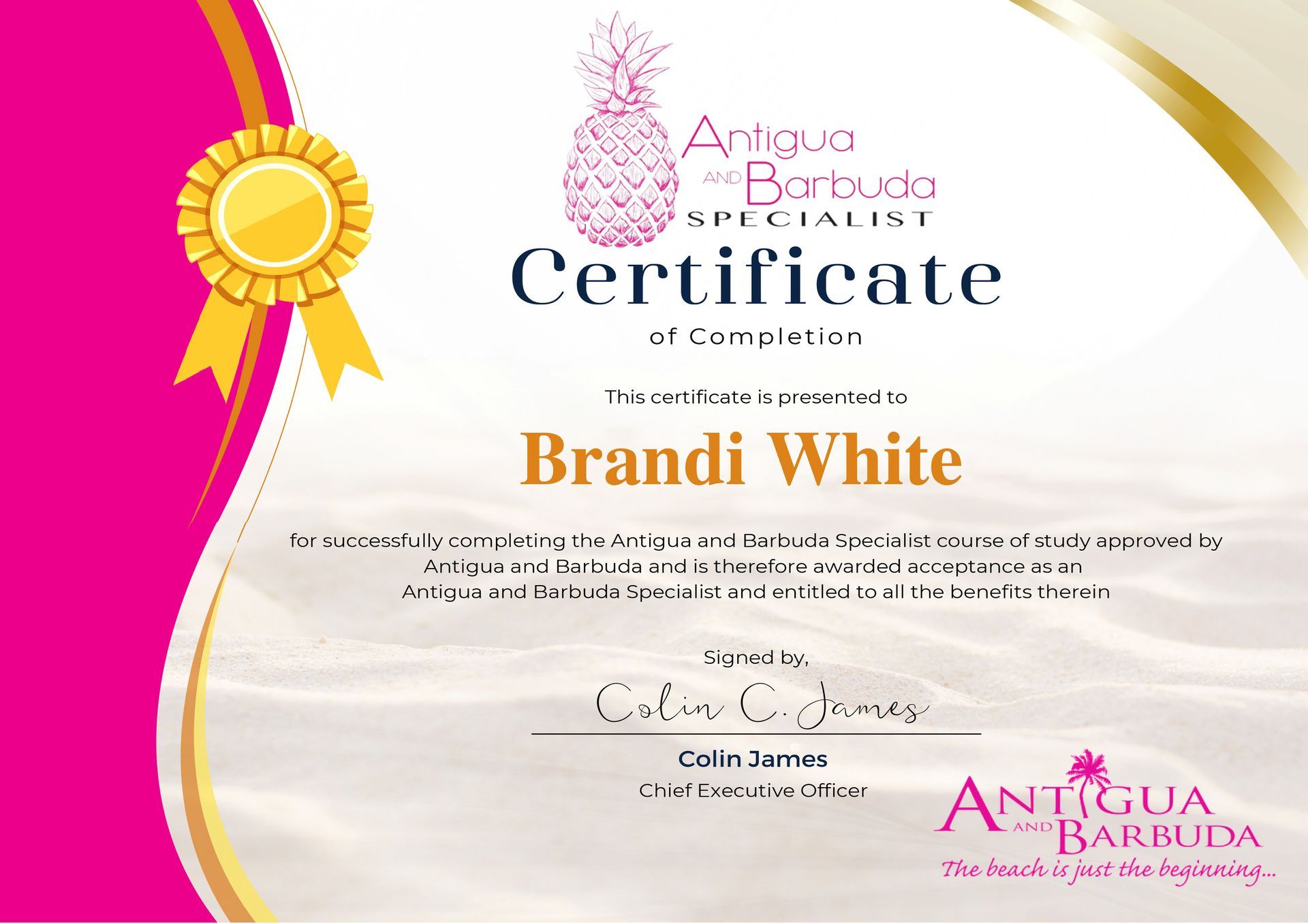 Specialist Certificates-Antigua Specialist, Hyatt Resorts Specialist, Jamaica Specialist, Sandals Specialist.